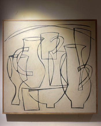 English artist, Lara Voce, creates still life paintings which have an abstract quality. She reduces everyday objects to their simplest forms, playing with texture by adding paint and building layers. Her pieces are marked by an uncommon luminosity. This is not achieved without effort; her works are formed by a meticulous series of painting, layering, sanding, and repainting. Often, the final product contains remnants of earlier compositions and memories. Lara works intuitively, sketching possible designs multiple times before selecting one and then executing it using acrylic paint for its speed. Through these multiple layers, sanding, and observation, the painting eventually comes to life.