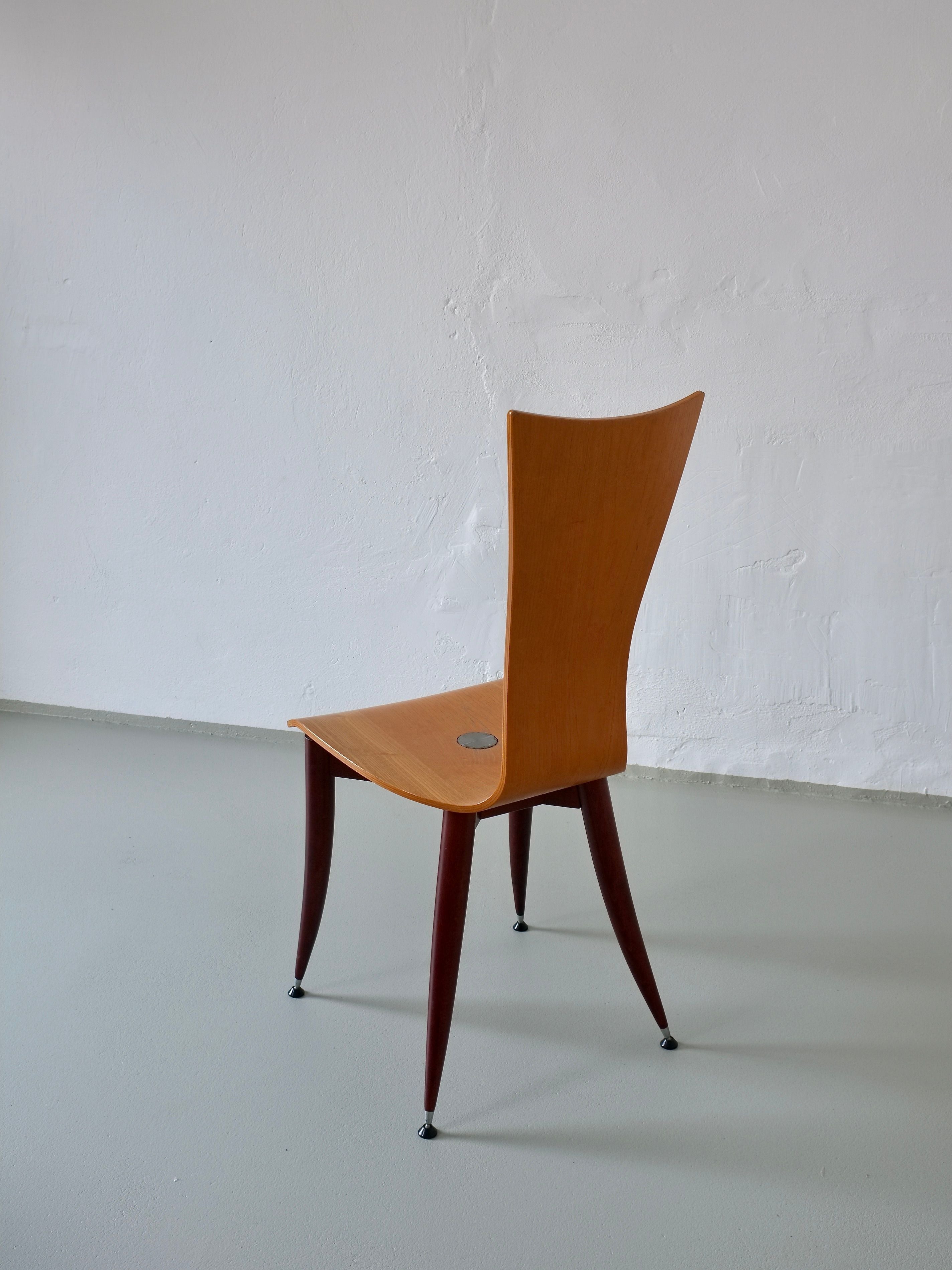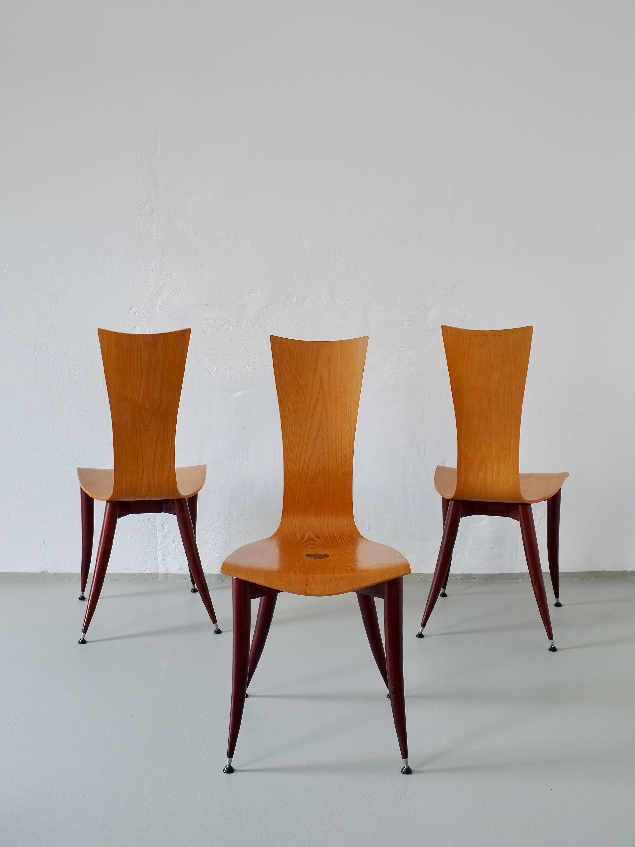Set of 3 Plywood Burgundy Legs Chairs, Italy 1980s