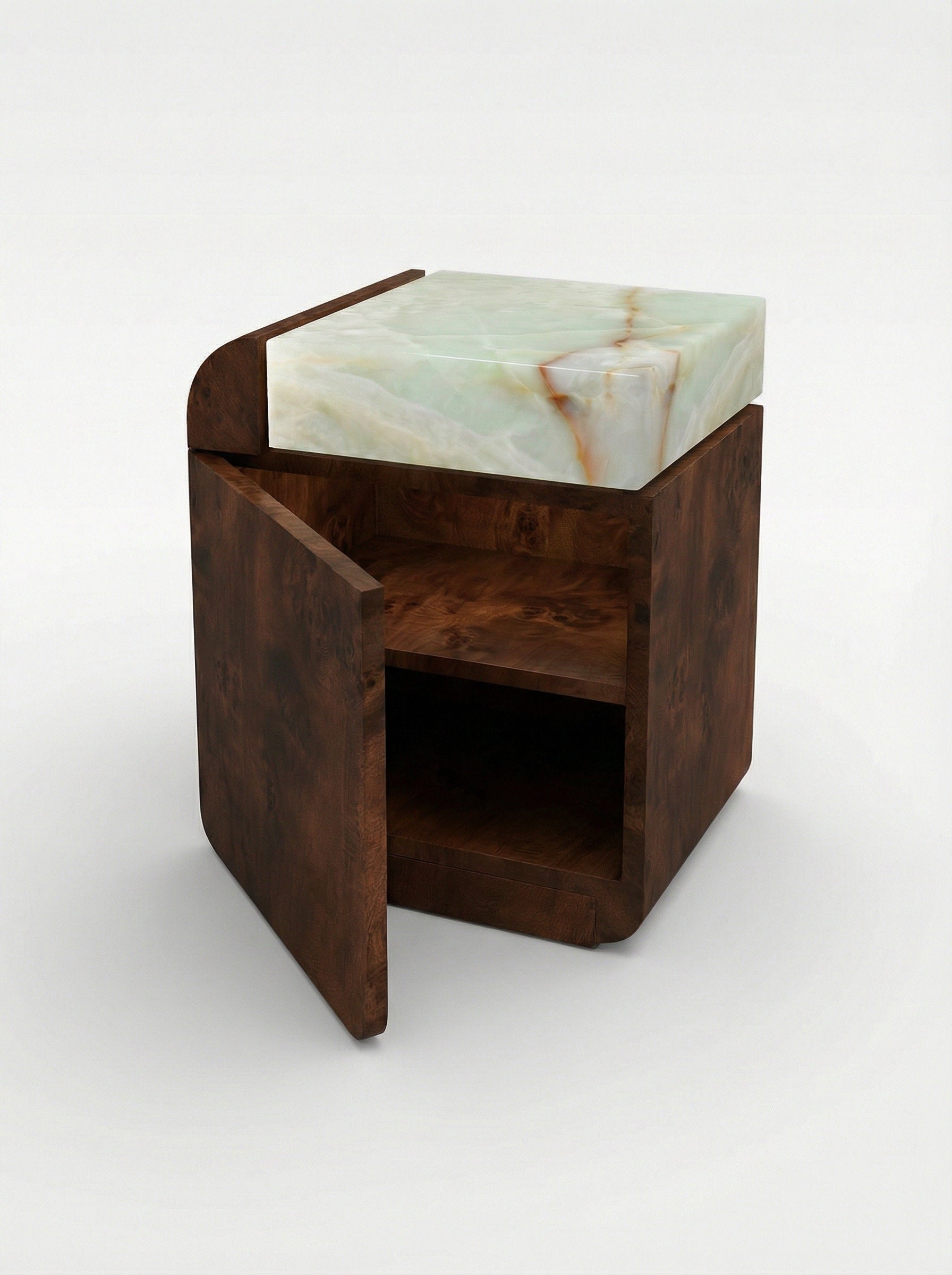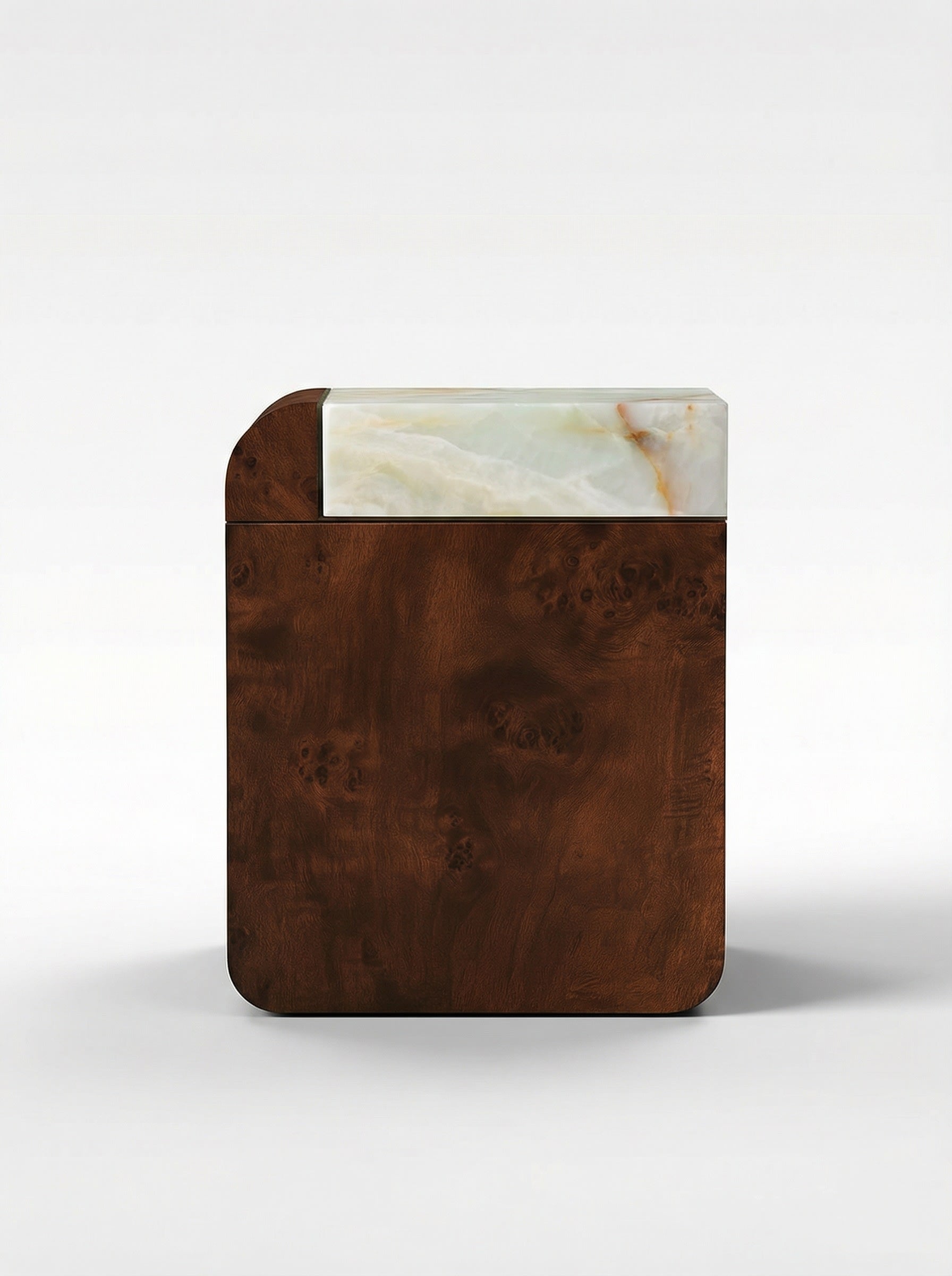Table de rangement en bois de loupe d'amo et onyx miel